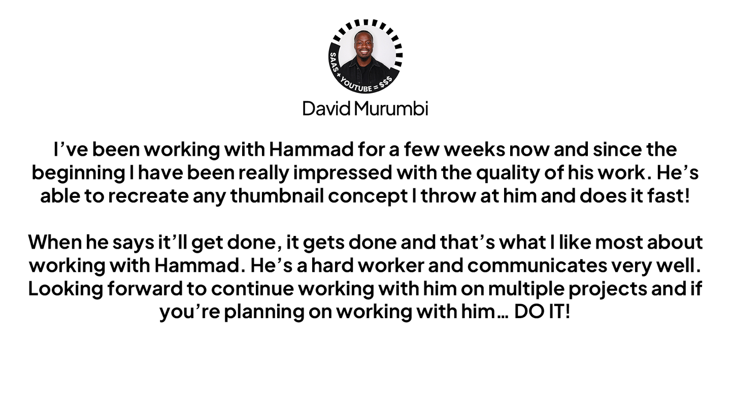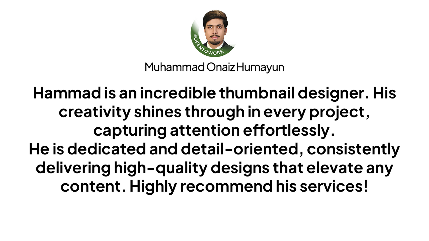 I'm a professional YouTube thumbnail designer with 2+ years of experience and 1000+ thumbnails delivered with multiple satisfied clients across YouTube. I worked with top creators and agencies worldwide. I'm specialize in bold, custom designs that boost clicks and engagement across finance, business, B2B, crypto, talking head, and many more.